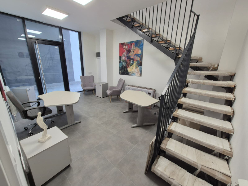 Sastoji od velike kancelarije i kupatila (na donjoj etaži 27m2) i galerije od 27m2).