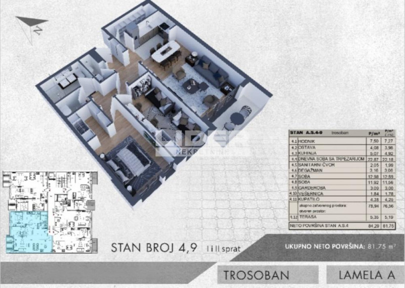 Od prostorija ima hodnik, ostavu, kuhinju, dnevnu sobu sa trpezarijom, sanitarni čvor, 2 sobe, garederoba, vešernica, kupatilo, terasa. agencijska provizija 2%
