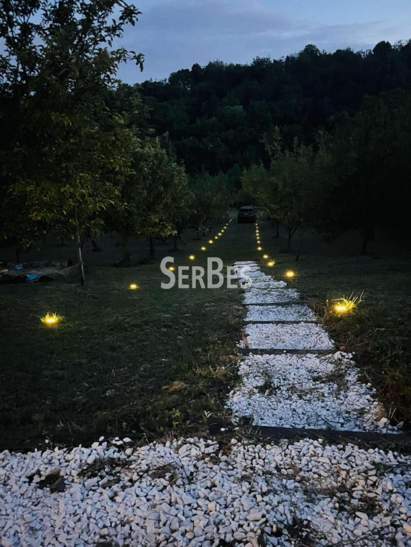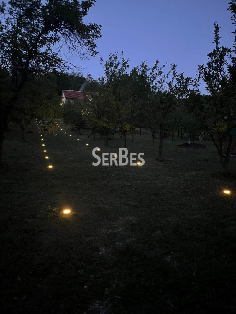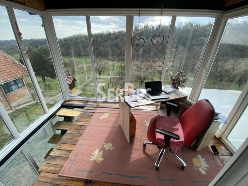Odlicna 3.5 vikend kuća 129m2 u Čortanovcima. Kuća se nalazi u prelepoj prirodi na placu od 39,9 ari . Kuća je gradjena od čvrstih materijala . Sastoji se od prizemlja i prvog sprata . Prednji deo kuće je ceo u staklenim portalima, tokom celog dana ima prirodne svetlosti . Prizemlje se sastoji od ustakljene prostorije za odmaranje, dnevnog boravka , kuhinje i kupatila . Na spratu se nalaze dve spavace sobe, kupatilo i zastakljena prostorija koja se može koristiti kao radni prostor. Poseduje i garažu od 12m2 iznad koje se nalazi terasa . Plac je pod nagibom u kaskadama , na podnožju placa parking. Ograda oko celog placa. Poseduje i voćnjak od više vrsta voća . Od infrasturkture ima struju , voda je iz bunara. Grejanje na čvrsto gorivo -drvo. Ima video nadzor. Uknjizenja 1/1 .