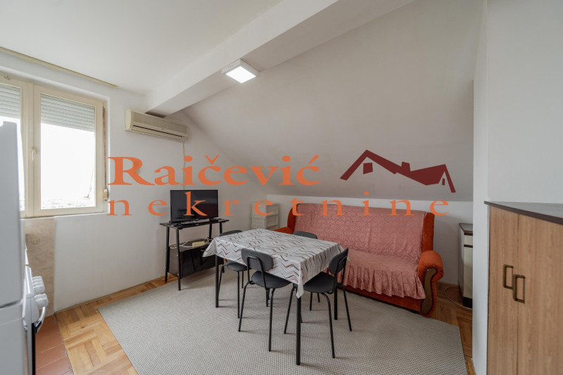 Dvosoban stan, svetao, izuzetno funkcionalan, dvostrano orijentisan, u potkrovlju, sa panoramskim pogledom na grad. Na spratu su dva stana. Idealan je za smestaj dve osobe ili troclane porodice.