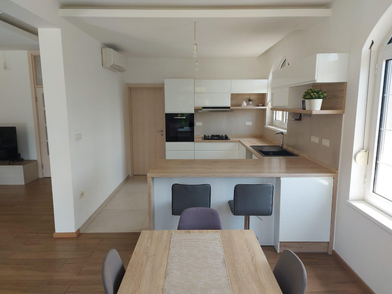 Prizemlje: velika dnevna soba spojena sa kuhinjom, trpezarijom, ostavom, 1 odvojena soba, kupatilo i 2 terase.