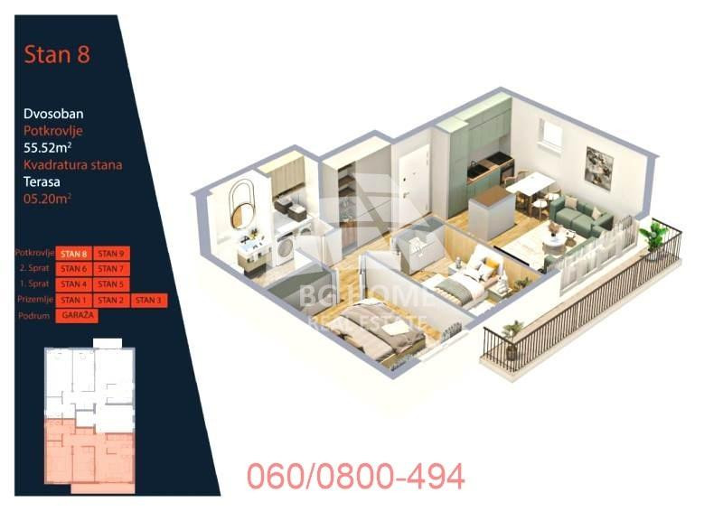Predstavljamo vam funkcionalan trosoban stan koji se sastoji od: dnevnog boravka sa otvorenom kuhinjom, dve spavace sobe, kupatila, terase i ulaznog hodnika.