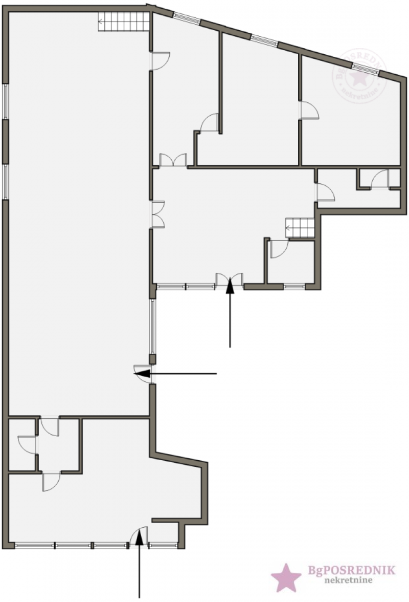 Sastoji se od jedne velike prostorije i više manjih, dva toaleta, čajne kuhinje na prvom nivou i identičan raspored na drugom nivou.