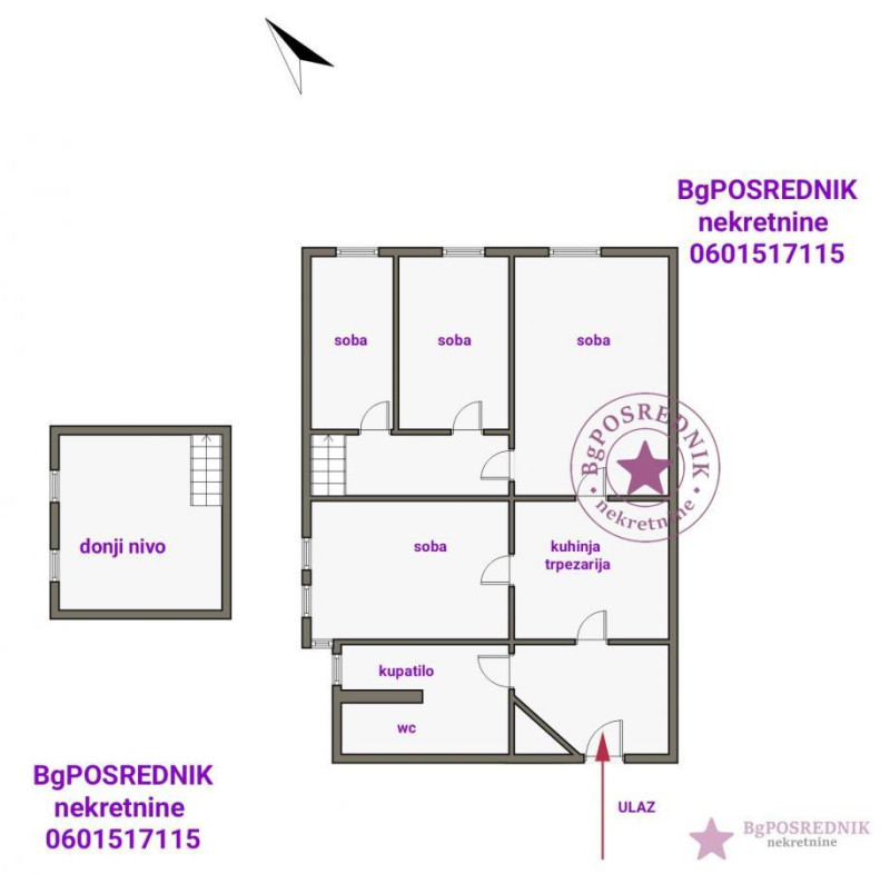 Stan odličnog rasporeda. Prostorije: predsoblje, dva hodnika, dnevna soba, kuhinjsko-trpezarijski deo, tri spavaće sobe, kupatilo, ostava, terasa.