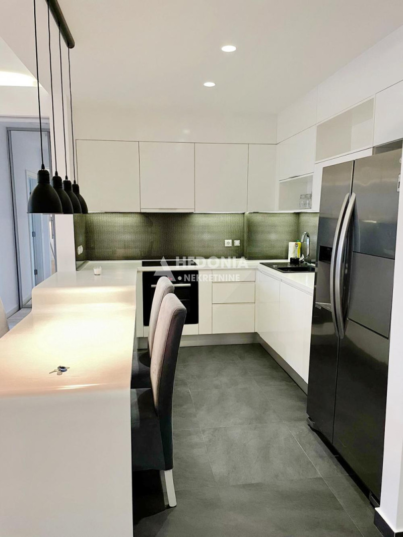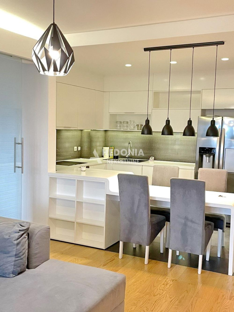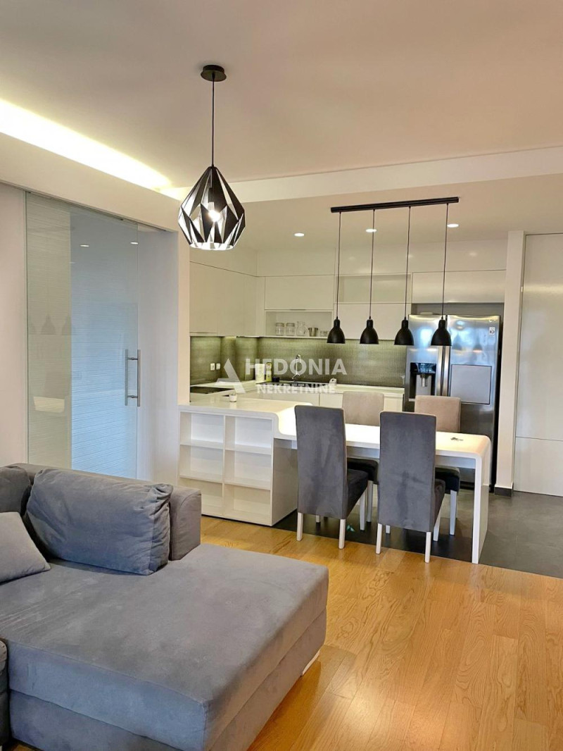 U prestižnom naselju na Novom Beogradu, West 65, koji je izvanredan primer spoja savremene umetnosti i arhitekture, nalazi se ovaj dvosoban stan za izdavanje. Impresivna izgradnja je učinila da ovaj deo grada postane simbol uspešnosti i kreativnosti. U West-u 65 se, osim modernih, po najsavremenijoj tehnologiji građenih zgrada, vodilo računa i o pejzažnom uređenju. U centru kompleksa nalazi se prelepo osvetljena fontana, pa ćete se osećati kao na moru. Uz veseli žamor ljudi iz okolnih kafića i restorana, učiniće da se osećate zdravo i raspoloženo. Deca, stariji sugrađani kao i kućni ljubimci su zaštićeni i sigurni u ovom kompleksu koji je sinonim za oazu mira, udobnog života i sveukupne lepote. Ceo kompleks ima dvadesetčetvoročasovno fizičko i video obezbeđenje. Stan je luksuzan i sastoji se iz dnevno-kuhinjsko-trpezarijskog dela, spavaće sobe, kupatila i terase. Izdaje se namešten. Mogućnost najma i garažnog mesta. Obavezan depozit prema zakupodavcu u visini rente + 50% provizija agencije za usluge posredovanja.
