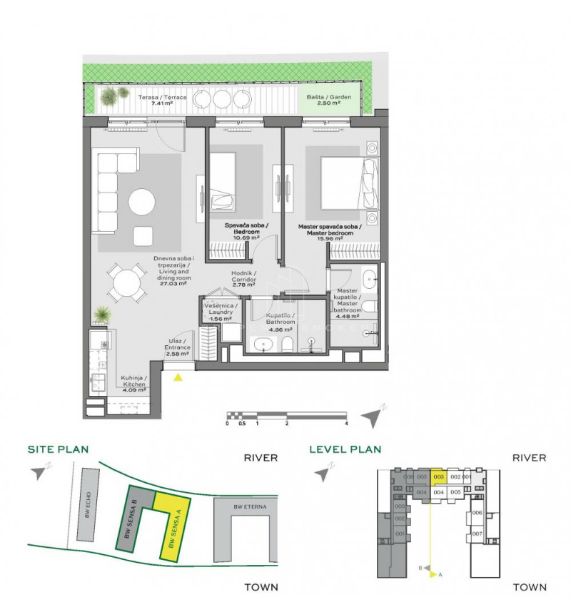 BW Sensa-nudimo veliki i prostran stan na prizemlju sa privatnom baštom, idealan za poslovni ili stambeni prostor. Sastoji se od: ulaznog hodnika, velikog dnevnog boravka sa trpezarijom i kuhinjom, direktnog izlaza na terasu, spavaće sobe, master spavaće sobe sa sopstvenim kupatilom, vešernice i još jednog kupatila. Stanu pripada terasa od 7 m2 i deo travnjaka-bašte od 2.5 m2. Izuzetno dobro pozicioniran za sve vrste poslovnih potreba, jer ima vidljivost sa ulice, u nivou lokala.
