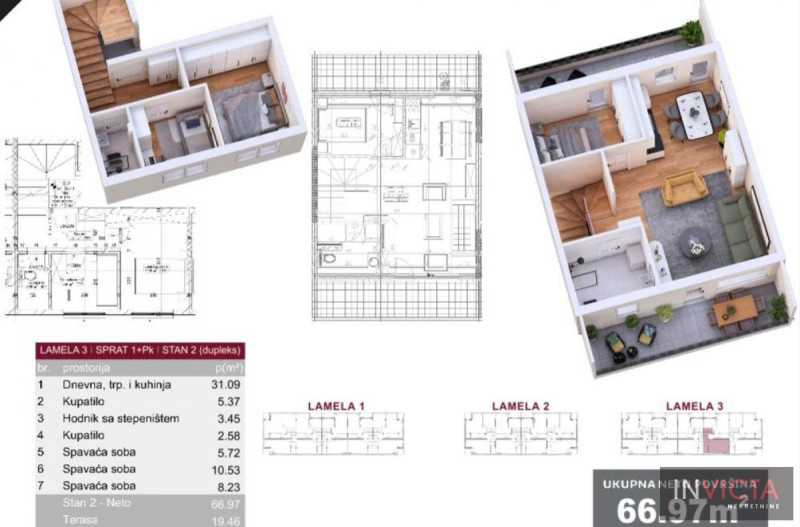 Atrakitvan, troiposoban porodični stan u maloj kvadraturi, ali koncepcijski odlično organizovan prostor. Stan se nalazi u manjoj zgradi u neposrednoj blizini Lipovog gaja, nalazi se na prvom spratu i dvoetažan je. U donjem nivou su dve spavaće sobe, veća i manja, kupatilo i prostor za garderobere u presoblju. Na gornjoj etaži se nalazi dnevni boravak sa kuhinjom i trpezarijom, vezom ka terasi, spavaća soba i kupatilo. Veoma funkcionalan stan sa pripadajućim parking mestom u dvorištu zgrade. Kvalitetna gradnja. Rok završetka obejakta je april 2026. U cenu je uključen PDV sa mogućnoišću povrata istog. U cenu je uključena i posrednička provizija. Broj u Reg.posrednika:475.