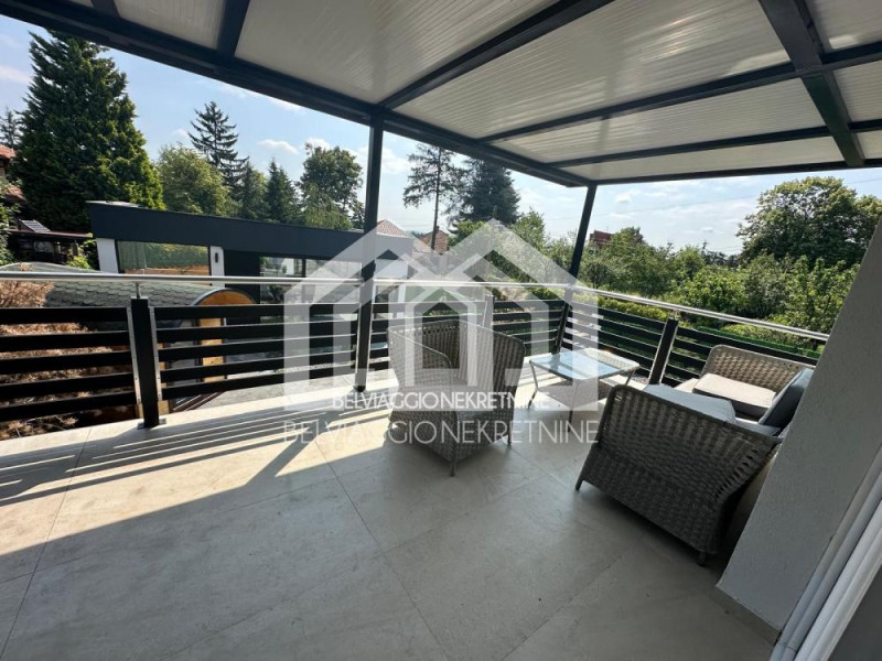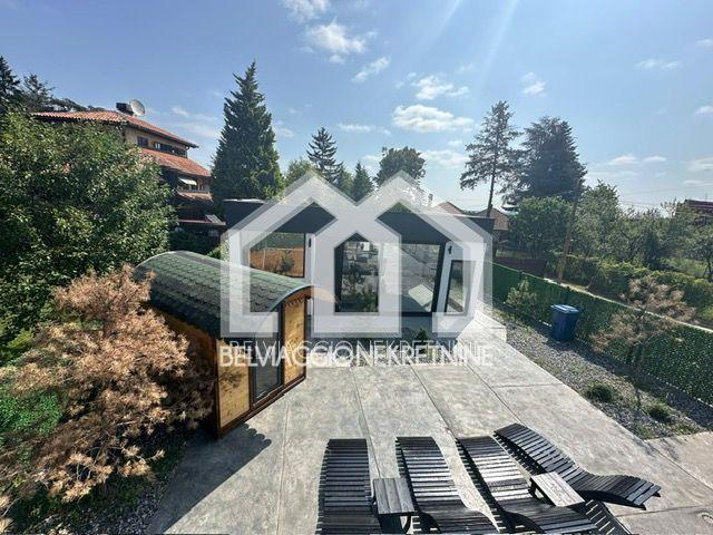 Nova, kompletno opremljena kuća u mirnom delu Beograda, okružena zelenilom. Kuća poseduje zatvoreni bazen, đakuzi i saunu u dvorištu. Opremljena je toplotnom pumpom koja greje i hladi sve prostorije.
