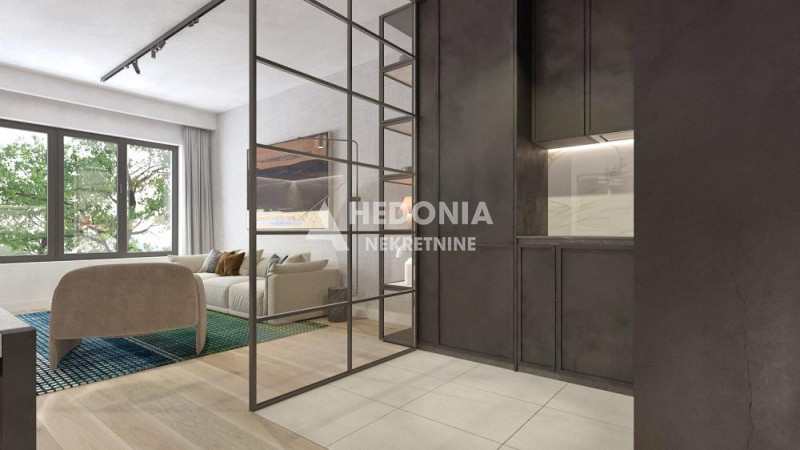 Stan je smešten na osmom spratu u zgradi sa recepcijom i obezbeđenjem. Po strukturi je garsonjera, nova i luksuzna. Sastoji se iz ulaznog hodnika, dnevno kuhinjsko trpezarijskog dela i kupatila. Izdaje se kompletno nameštena i opremljena na duži vremenski period. Odmah useljiva. Obavezan depozit prema zakupodavcu u visini rente + 50% provizija agencije za usluge posredovanja.