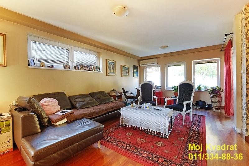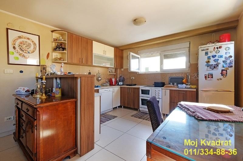Druga etaža (prizemlje) - trosoban stan: veliki dnevno - trpezarijsko - kuhinjski deo sa izlazom na terasu i u dvorište, dva mokra čvora, dve spavaće sobe.
