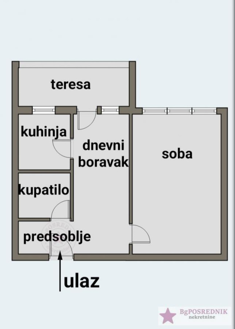 Funkcionalnog rasporeda: predsoblje, kuhinja, dnevni boravak (iz kojeg se izlazi na lođu), prostrana soba, kupatilo sa toaletom, lođa.