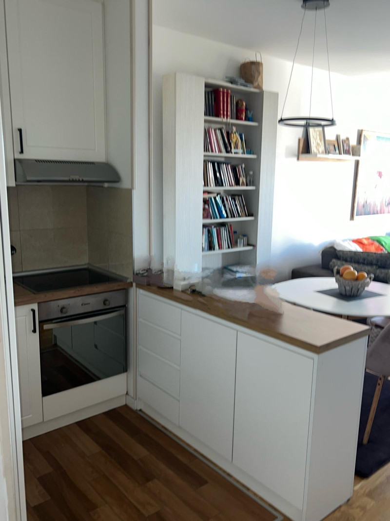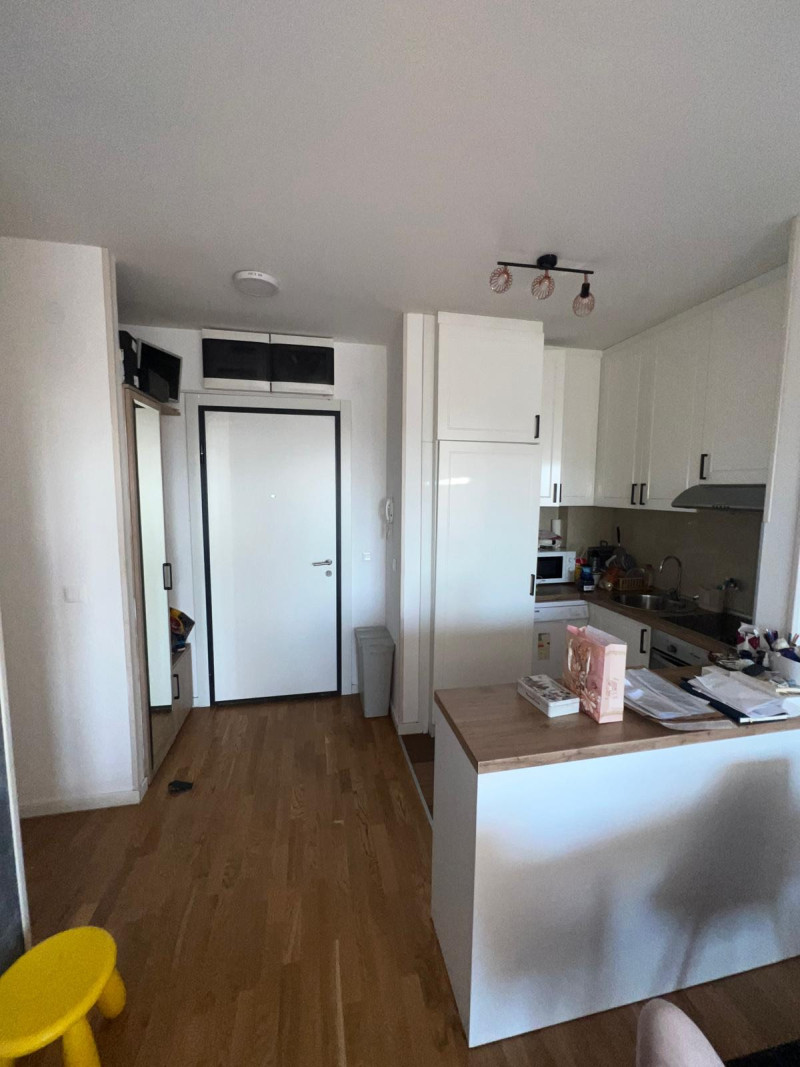 Stan ima predsoblje, dnevnu sobu sa kuhinjom i trpezarijom i izlazom na veliku lodju.