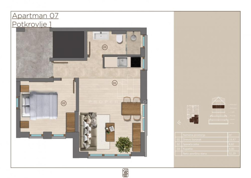 Stan se sastoji od: ulaznog hodnika, dnevno trpezarijskog dela sa kuhinjom, spavaće sobe i toaleta.