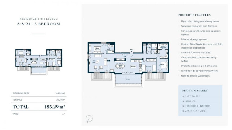 Stan se sastoji od: otvorenog koncepta dnevne sobe i trpezarije, kuhinje, prostranih balkona i terase, tri spavaće sobe od kojih su dve master, sa master kupatilima, kupatila i toaleta.