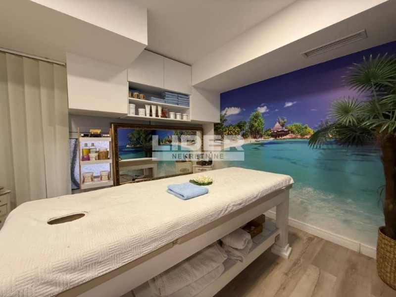 Na prvom nivou nalazi se impozantno velika prostorij, kuhinja, tehnička soba, toalet sa dva m.č., odvojen deo sa laserima, pedikirom, prostorije za masažu, u gornjem delu je velika prostorija iz koje se ide u ostale sobe i takodje odvojen toalet.