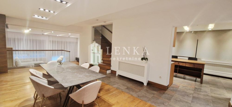 Specijalna ponuda retko u ponudi u rezidencijalnom delu Dedinjaizdaje se kuča sa dva parking mesta u garaži objekta. Mikrolokacija je odlično saobraćajno povezana sa ostalim delovima grada što olakšava mreža novih gradskih saobraćajnica . U neposrednoj blizini objekta nalazi se nekoliko internacionalnih škola i vrtića, pijaca, marketi, veliki broj restorana i kafića.. Na samom ulazu u objekat vas dočekuju stepenice, podest i hol od granitne keramike. Na ulazu u nekretninu prostor na prvom nivou otvori će Vam i blindirana sigurnosna vrata sa ukrasnim panelom i ino bravom. Široki ulazni hodnik vas vodi u prostrani open space produženi dnevni boravak koji odiše udobnošću i toplinom upotpunjen trpezarijrijom gde ćete ušivati u hrani i piću sa Vašim najmiliima. Kuhinjski prostor je uređen veoma lepo te je u njemu spojena spojena esttetika i funkcionalnost. Konfor ovog prostora se vidi kroz svedeni blok od još tri spavaće sobe sa garderoberom i prostorom za ćminkanje.Iz dnevnog boravka se izlazi na terasu sa koje se pruža pogled od XY$. Dva kupatila, dva toaleta (plus vešeraj)od kojih je jedno sa tuš kabinom a drugo sa ležećom kadom, oba su izuzetno lepa i odišu funkcionalnošću dobijenom kroz izabrane boje i podržano toplim materijalima tako da deluju opuštajuće a keramika sanitarije I sanitarna galanterija je italijnske, nemačke i španske proizvodnje. Spoljašna stolarija visokog kvaliteta sa roletnama i velikim oknima tako da je obezbeđen mali koeficijent ulaza i izlaza toplote, odlično je zvučno izolovan, na podovima hrastov parket , jednokrilna sobna vrata , prostor je klimatizovan i razvučena je mreža radijatora . Alarmni sitem, kamere i optika su ugrađeni u ceo prostar, u suterenu se nalazi hobi prostor sa saunom i jakuzi kadomi, garaža za dva automobila ostava i tehnička prostorija Retko u ponudi atraktivna nekretnina koja pruža pun konfor . Zakupac plaća proviziju 50% od ugovorene mesečne rente