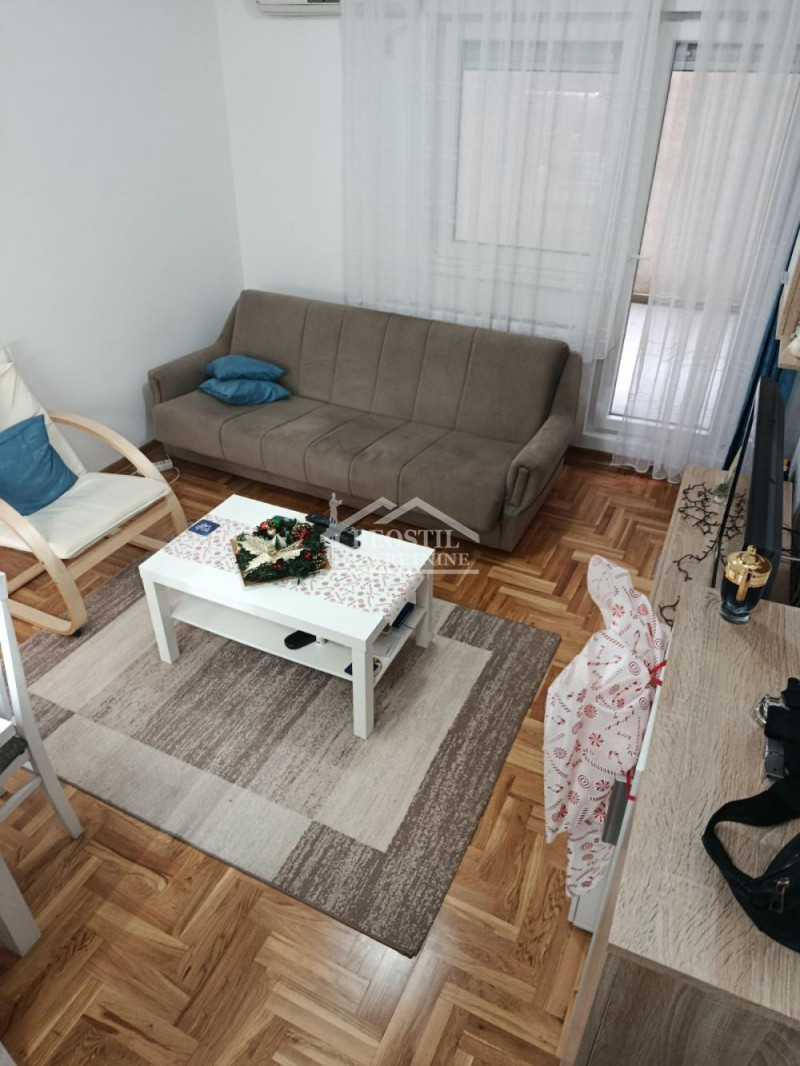 Odlično koncipiran jednoiposoban stan. Ulazni deo odvojen zidom od ostalog dela stana. Mala kuhinja i trpezarija, dnevni boravak, mali koridor do kupatila sa mestom za veš mašinu i dosta prostrane sobe sa pogledom n aterasu od 15m2. PVC stolarija sa roletnama, medijapan unutrašnja stolarija, hrastov parket.