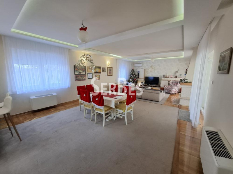 U prizemlju se nalazi predsoblje iz kojeg se ulazi u prostran i svetao dnevni boravak sa kuhinjom , komforno kupatilo , jedna soba upotrebljena za ostavljanje mobilijara za bazen manja tehnička prostorija i stepenište. ispred dnevnog boravka natkrivena velika terasa .Dnevni boravak je opremljen ugaonom garniturom i velikim kućnim bioskopom, a u okviru otvorenog koncepta nalaze se kuhinja i trpezarija. Poseban ugođaj daje kamin, dok iz dnevne sobe postoji direktan izlaz na terasu i dvorište. Na spratu se nalazi spavaći blok sa četiri komforne spavaće sobe i zajedničkim kupatilom sa tuš-kabinom. Svaka soba je klimatizovana. Glavna spavaća soba ima francuski ležaj, izlaz na terasu i prelep pogled na bazen. U dvorištu se nalazi: parking za dva vozila, velika natkrivena terasa, idealna kao letnjikovac tokom leta, bazen dimenzija 8m x 4m, dubine 1,7m. Dvorište ograđeno zidanom ogradom, kao i drvećem, i kolska kapija na daljinsku lomandu. Kuća je ipogodna za porodicu ili one koji žele komfor, privatnost i luksuz u mirnom okruženju. Odmah useljiva . Zakup 2000EUR + depozit 2000EUR + agencijska provizija 1000EUR .