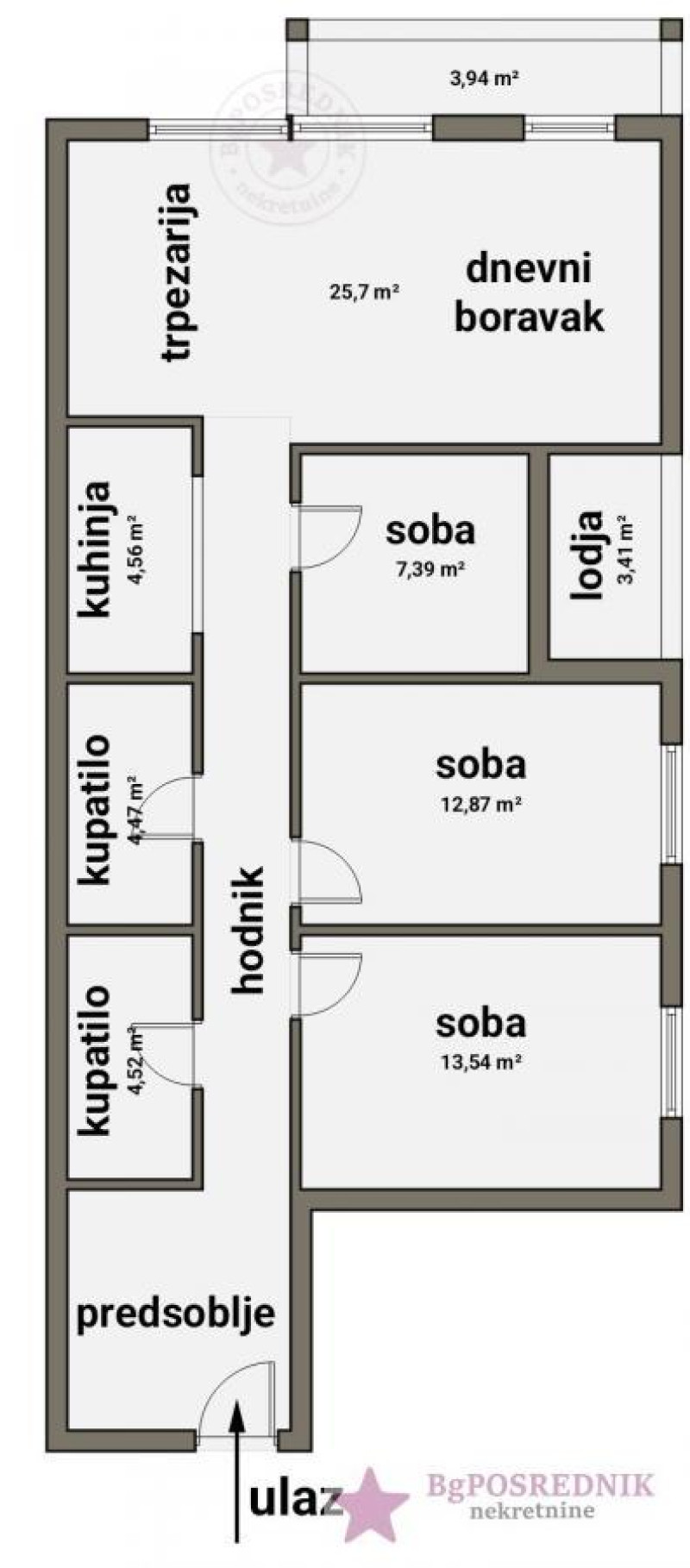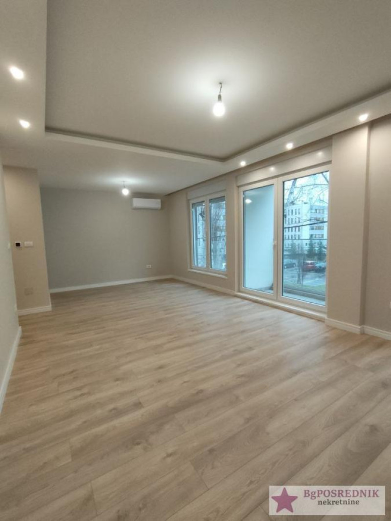 Funkcionalnog rasporeda, sastoji se od: predsoblja, dnevnog boravka sa trpezarijom i terasom, kuhinja, tri spavaće sobe od kojih je jedna soba sa lođom.