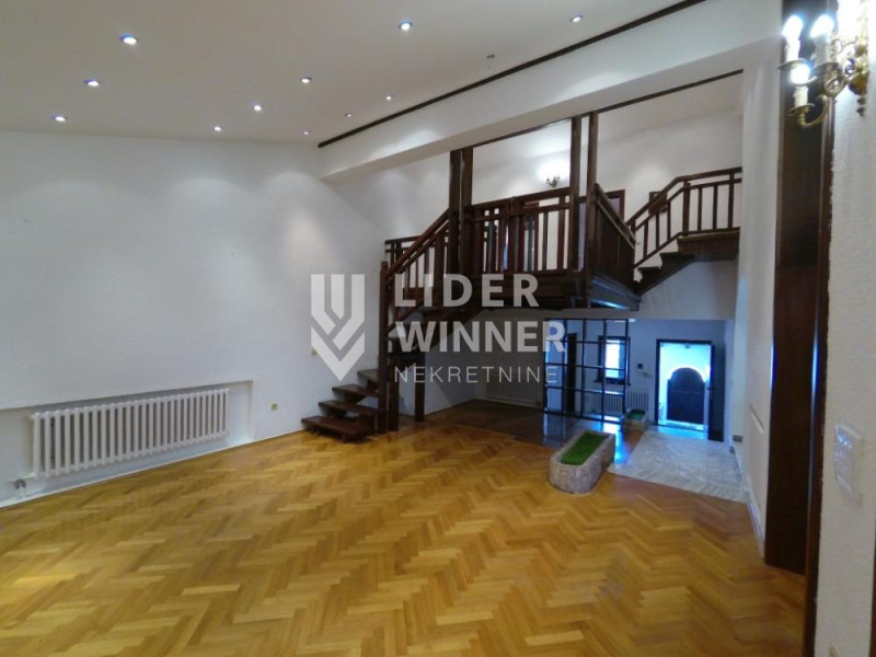 Kupatilom , prostran dnevni boravak sa kaminom i pogledom na malo dvorište od 26m2, trpezarije, kuhinje iz koje se izlazi u dvorište a u samom dvorištu je veća ostava.Takodje na ovom nivou se nalazi jedna soba. Iz ovog dela silazi se u garažu.