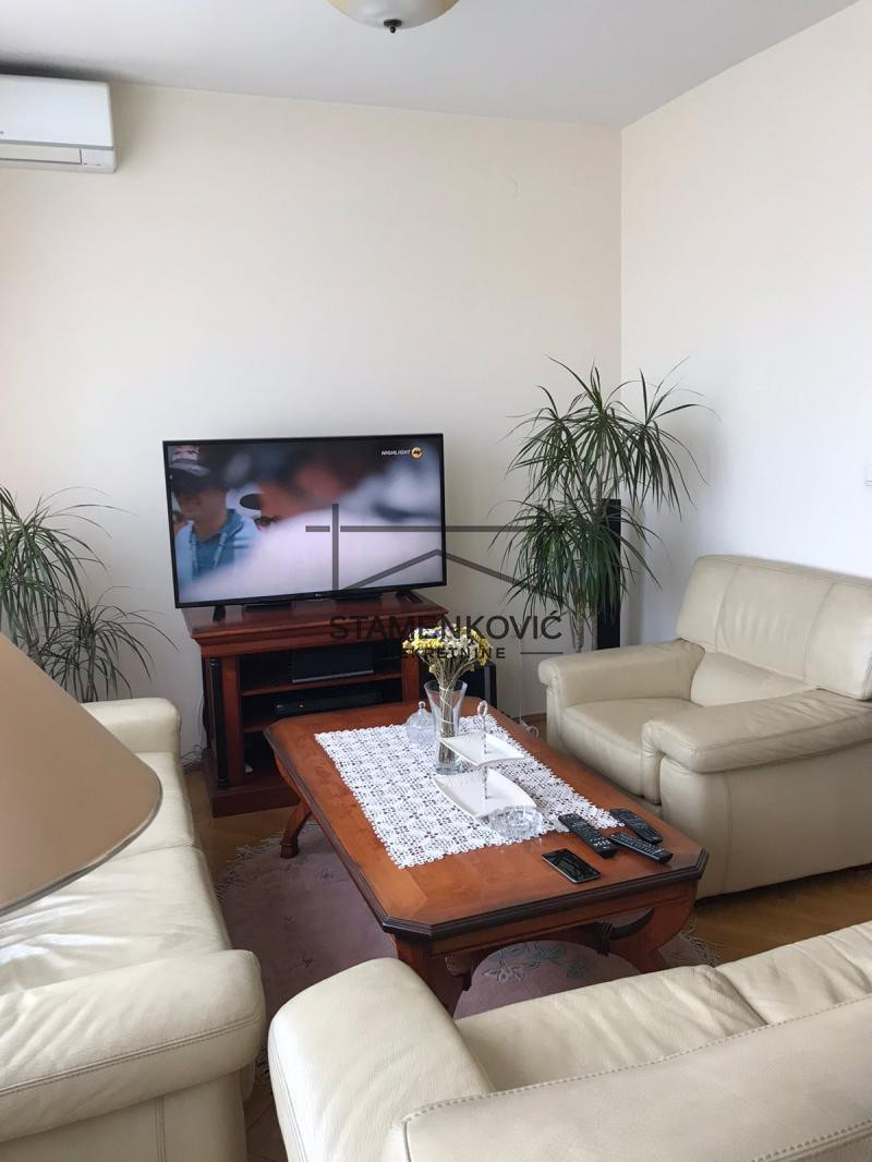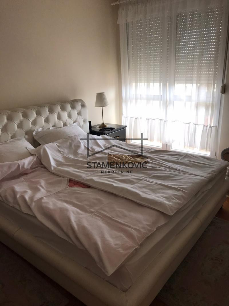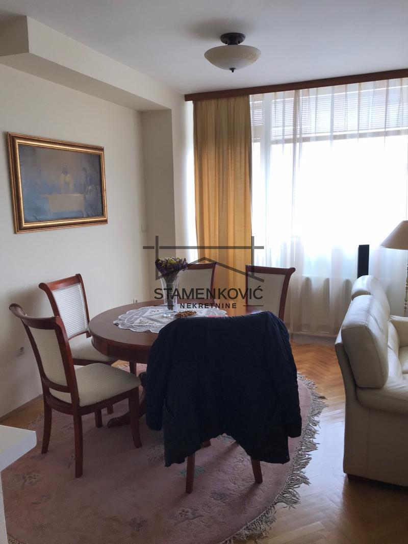 Četvorosobni stan u uzem centru Grada. Pogodan za porodicu sa troje dece. Dnevna soba sa trpezarijom i kuhinjom i toaletom su jedna etaža. Iznad tri zasebne sobe i kupatilo sa đakuzujem.