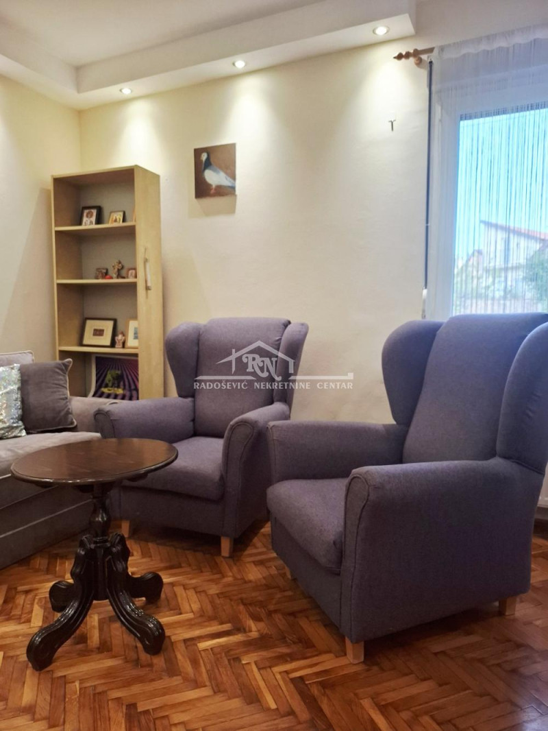 Kompletno namešten, odmah useljiv, ima etažno grejanje na struju, klimu, PVC stolariju.