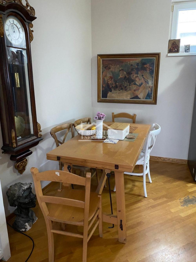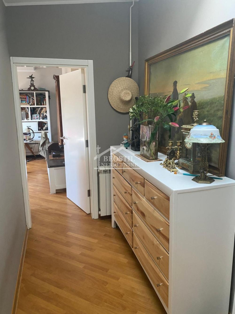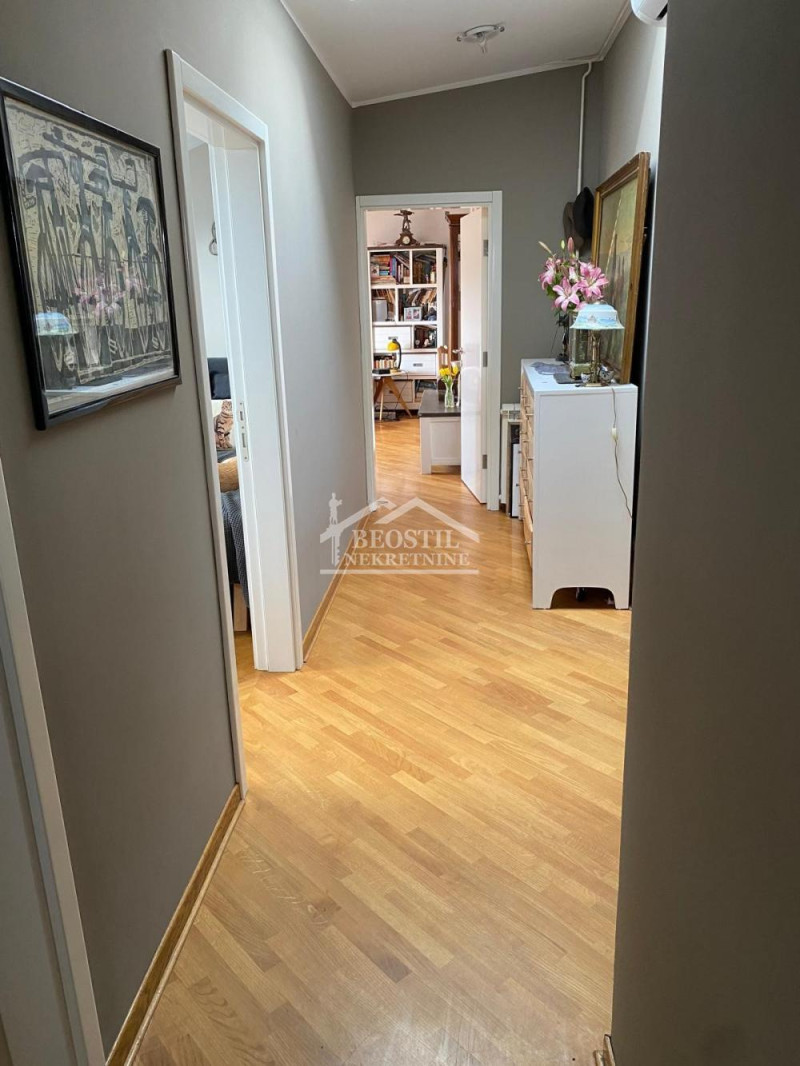 U prodajnu cenu je uključeno i uknjiženo garažno mesto od 13m2 (na klackalici). Ulazni deo stana se sastoji iz hodnika sa visokim plafonima i prirodnim osvetljenjem, iz kojeg se ulazi u sve prostorije; stan ima jedno veće kupatilo (sa prirodnim osvetljenjem), zatim prostoriju koja služi kao garderober, dve spavaće sobe (koje imaju kosine i krovne prozore i prostor za odlaganje u kosinama), dnevno-trpezarijski prostor sa kuhinjom i lođu sa pogledom na Dedinje i Bajfordovu šumu.Zgrada je izuzetno kvalitetno građena, stan se odlikuje odličnom zvučnom i toplotnom izolacijom, a na poslednjem spratu se pored ovog stana nalazi samo još jedan stan, što ga čini izuzetno prijatnim za stanovanje (lift ide do 6. sprata). Stan je u dobrom stanju, potrebno je higijensko krečenje i manja ulaganja i brzo je useljiv. Važno je još reći da se ova nekretnina nalazi na izuzetnoj lokaciji jer su u neposrednom okruženju fakulteti - FON, Fakultet političkih nauka, kao i osnovne, srednje i više škole. Stan je okrenut ka mirnoj ulici, dok se s druge strane zgrade, duž Bulevara oslobođenja, prostire Bajfordova šuma od Zvezdinog stadiona sve do Banjice.