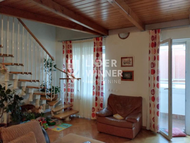 Stan ima dve spavace sobe, dve terase i dva kupatila pri cemu postoji mogucnost da se uz krovne prozore na galeriji dobije jos jedna soba. Stan se prodaje sa ugradnim ormarima i kuhinjom. Na gornjem nivou se nalaze dve spavace sobe koje su povezane sa terasom na gornjem spratu. Lokacija stana u mirnoj neprometnoj ulici I blizina prevoza ka svim delovima grada kao I kompletna infrastruktura, skole, obdaniste, marketi obezbedjuju izuzetno udobnost za porodican zivot. agencijska provizija 2%
