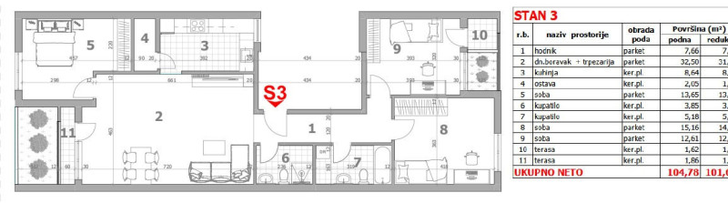 |  | Država | Srbija |  | Grad | Novi Sad |  | Naziv ulice | Veternik |  | Cena | 162.300 €  (1.607 €/m2) |  | Površina m² | 101 m2 |  | Broj soba | 4 |  | Sprat | 2 |  | Dodatni podaci