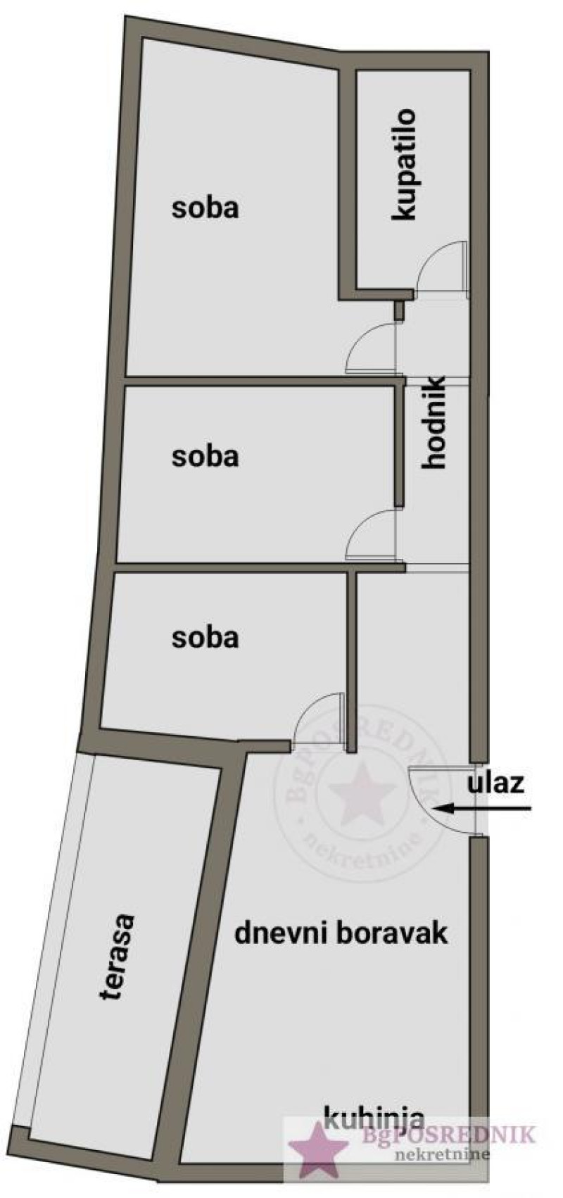 Stan je jednostrano orijentisan, svetao i ušuškan, i sastoji se od: hodnika, kuhinje sa trpezarijom i dnevnom sobom, tri spavaće sobe, kupatila i terase.