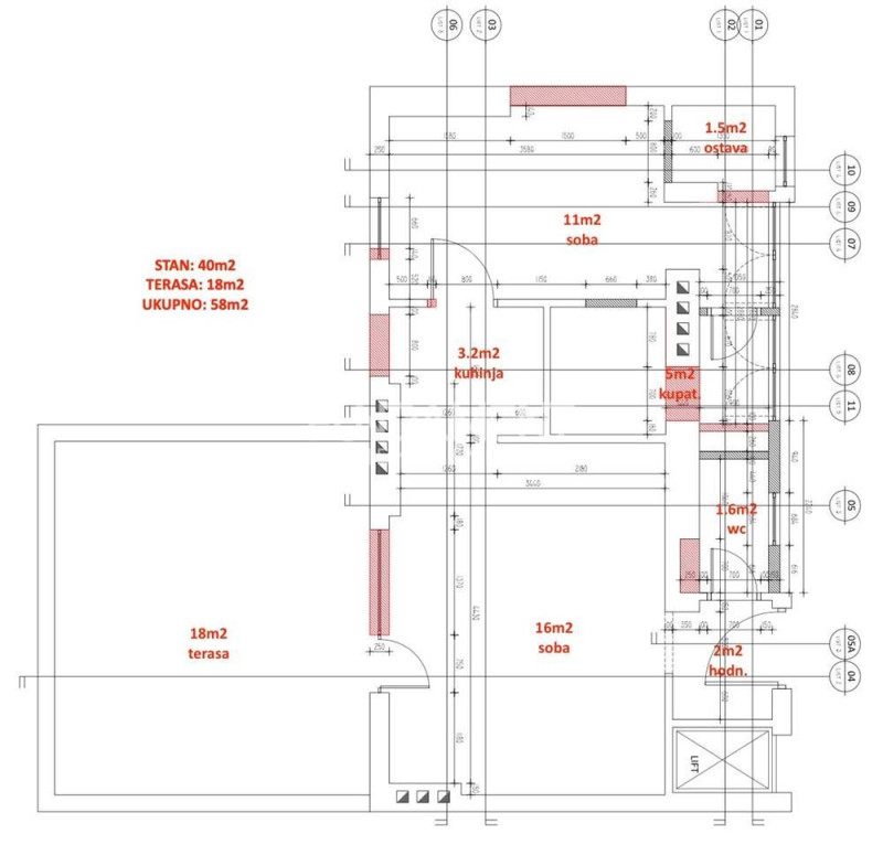 Ukupna površina stana je 58m2, od čega je 40 m2 grejna površina i 18m2 terasa sa koje se pruža predivan pogled na grad i reku.