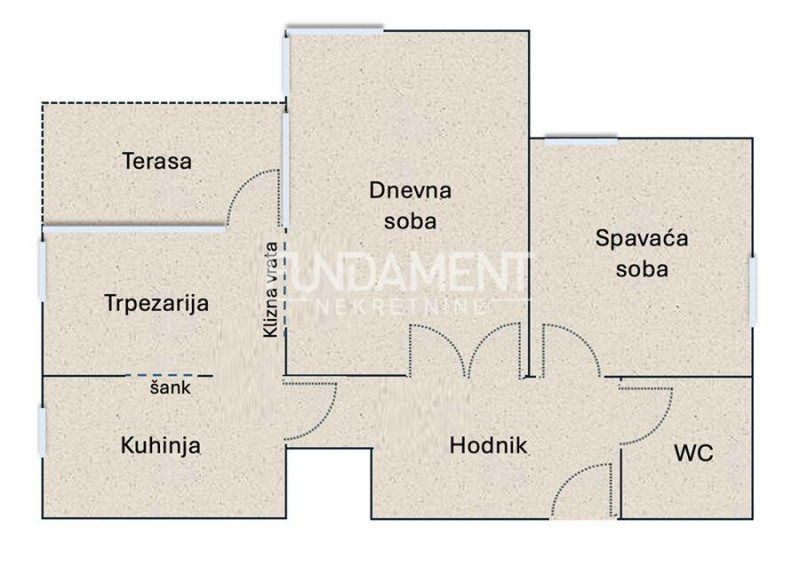 Sastoji se od: ulaznog hodnika, prostrane dnevne sobe, kuhinje, trpezarije, velike terase sa lepim pogledom na zelenilo, spavaće sobe i kupatila.