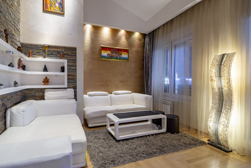 Opremljen je vrhunskim materijalima i tehnikom. Prodaje se kompletno namesten,