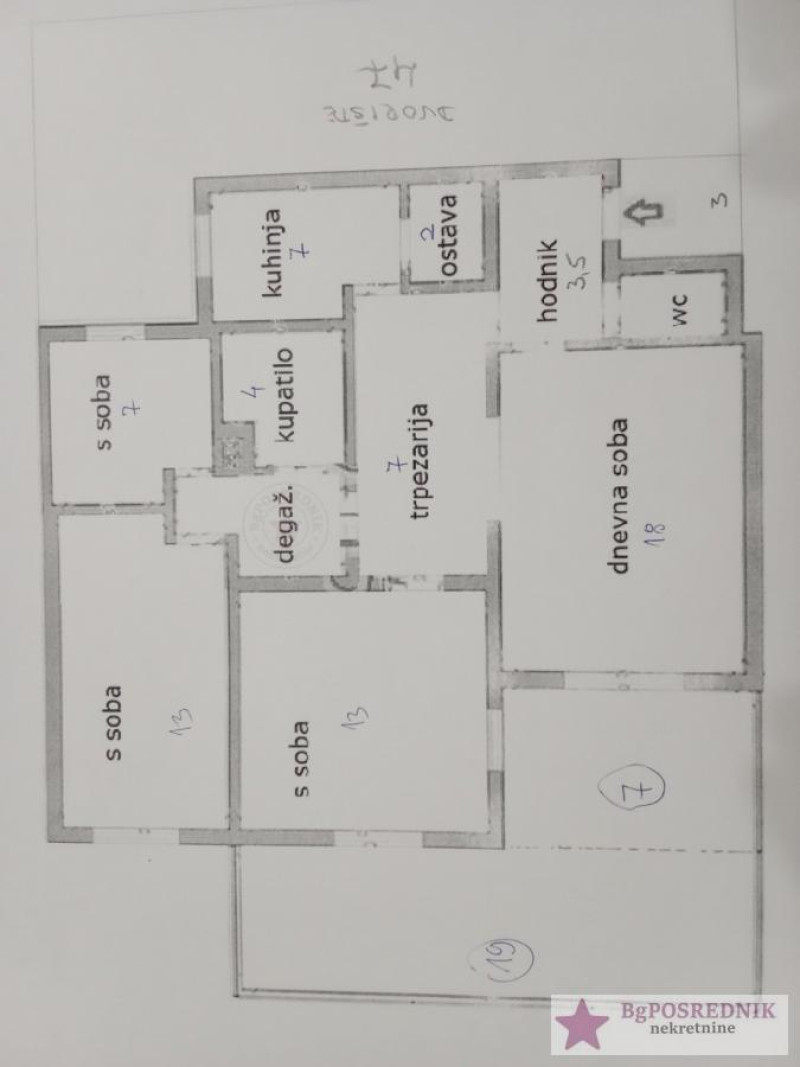 Prostorije: tri spavaće sobe, prostran dnevni boravak sa izlazom na terasu, odvojena kuhinja sa trpezarijom, kupatilo, toalet i ostava.