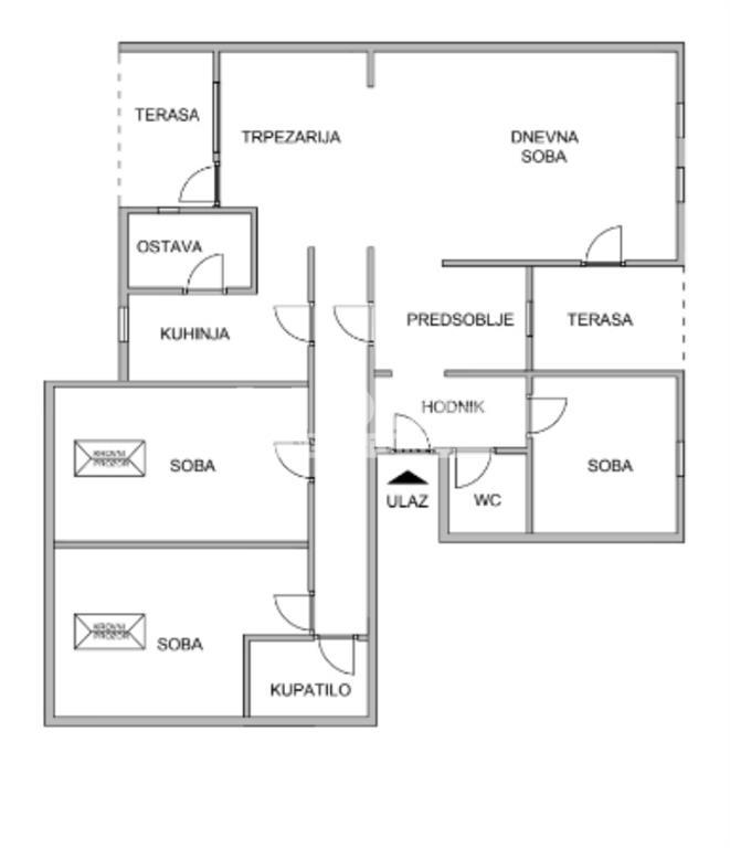 Ulazni hodnik, manja spavaća soba i wc, desno terasa. Pravo iz predsoblja dnevna soba, levo trpezarija, terasa, ulaz hodnik sa kuhinjom, ostavom. Dve veće spavaće sobe, kupatilo iz predosoblja, desno ulaz u hodnik. agencijska provizija 2%