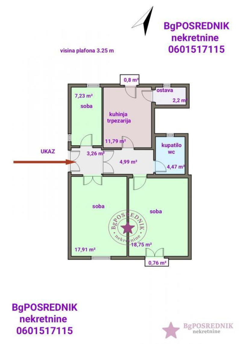 Prostorije: hodnik, mala soba, dve velike sobe, kuhinja sa trpezarijom, ostava, wc/kupatilo, dve terase.