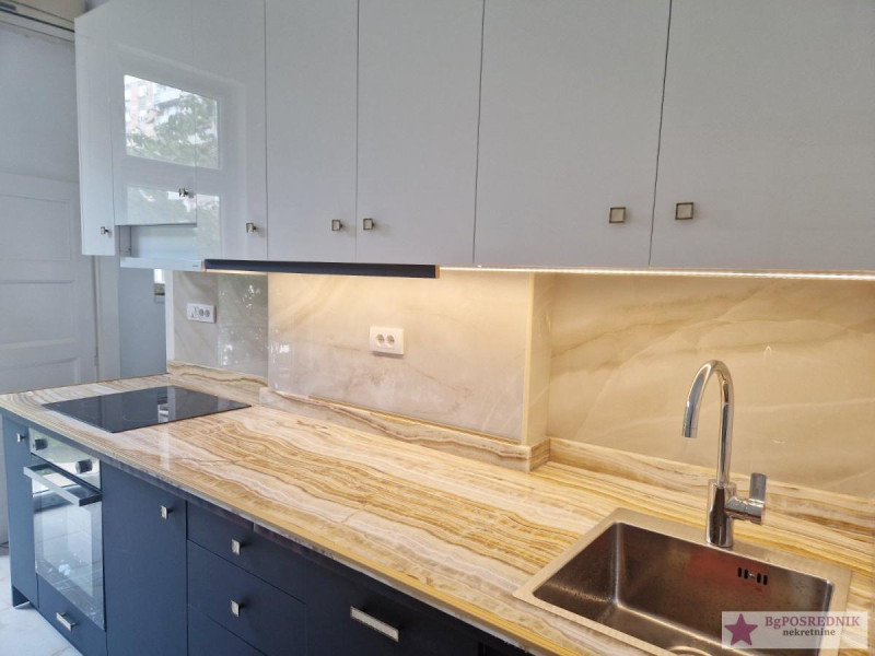 Kompletno renoviran, u stanu ostaje ugradna kuhinja sa tehnikom i radna ploča- onix mermer, nova spoljna stolarija- trostruka stakla, kompletno renovirano kupatilo.