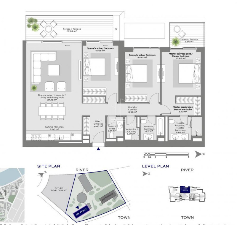 Nudimo savršeno funkcionalan i lepo pozicioniran stan u zgradi BW Perla.Sastoji se od: dnevnog boravka sa trpezarijom i kuhinjom, prostrane terase, tri spavaće sobe, vešernice, dva kupatila i toaleta.