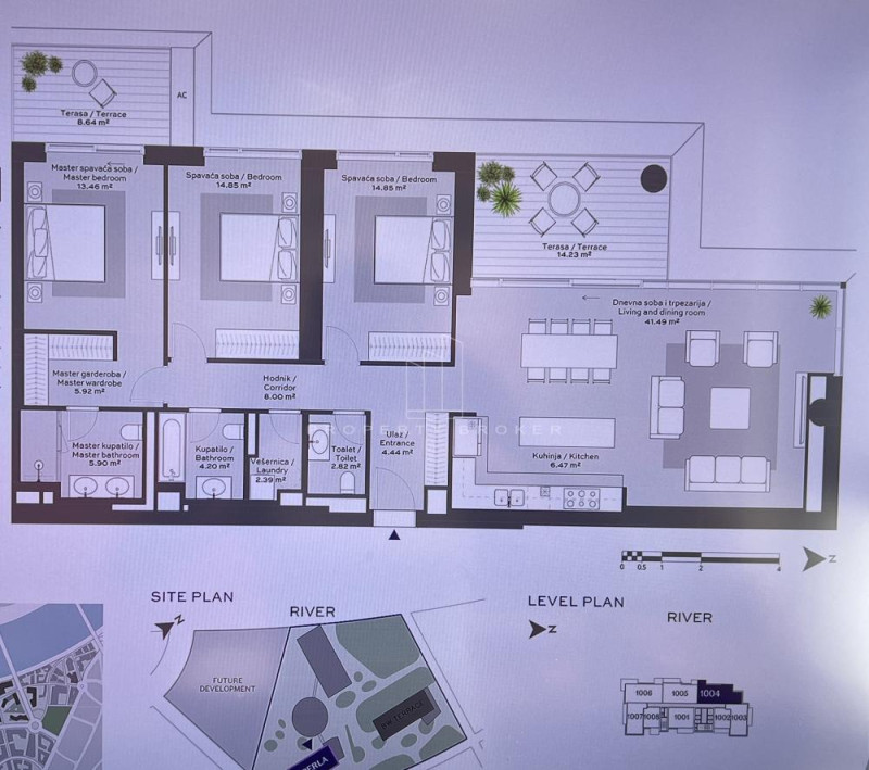 Nudimo stan u premium zgradi BW Perla u prvom redu do reke. Sastoji se od: dnevnog boravka sa trpezarijom i kuhinjom, prostrane terase, tri spavaće sobe od kojih je jedna master soba sa sopstvenim kupatilom i terasom, vešernice, dva kupatila i toaleta. Prostran stan, ugaona pozicija, dvostrana orijentacija, pogled na reku.