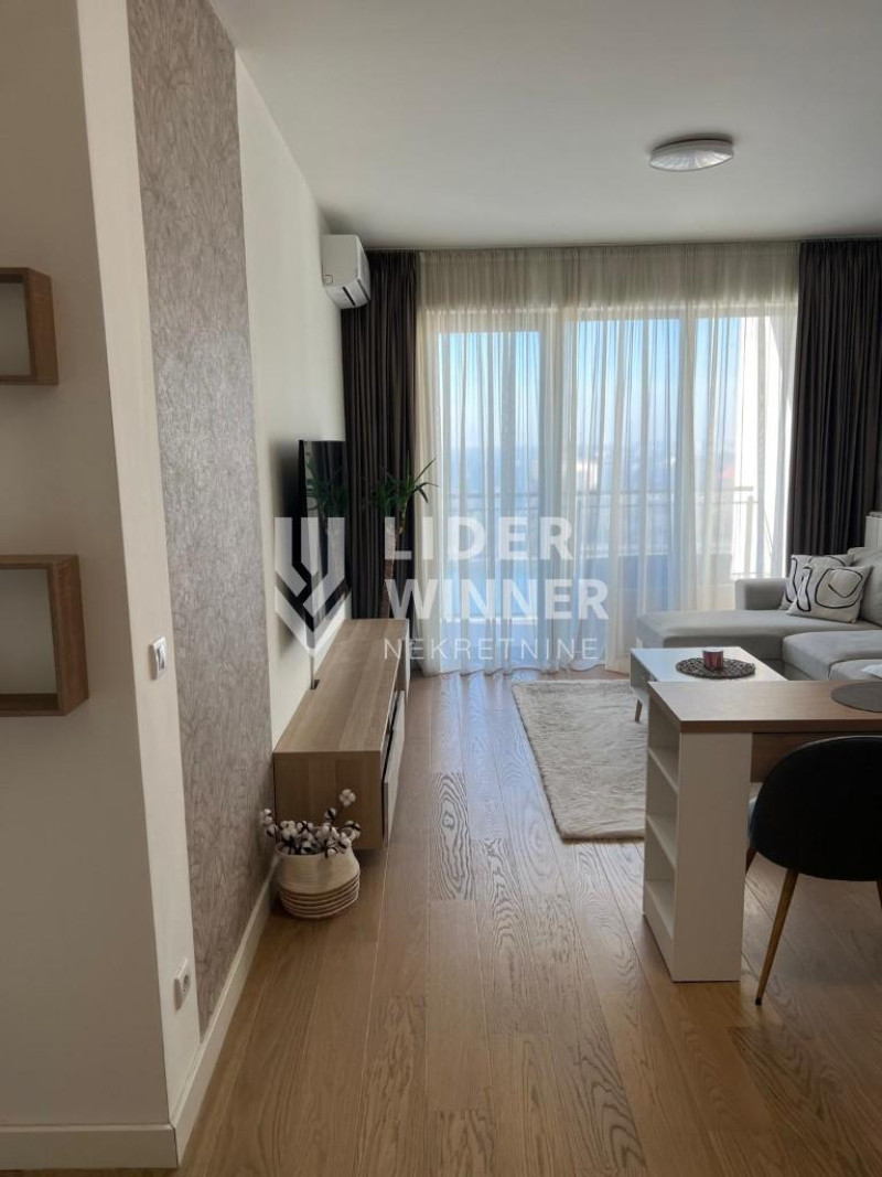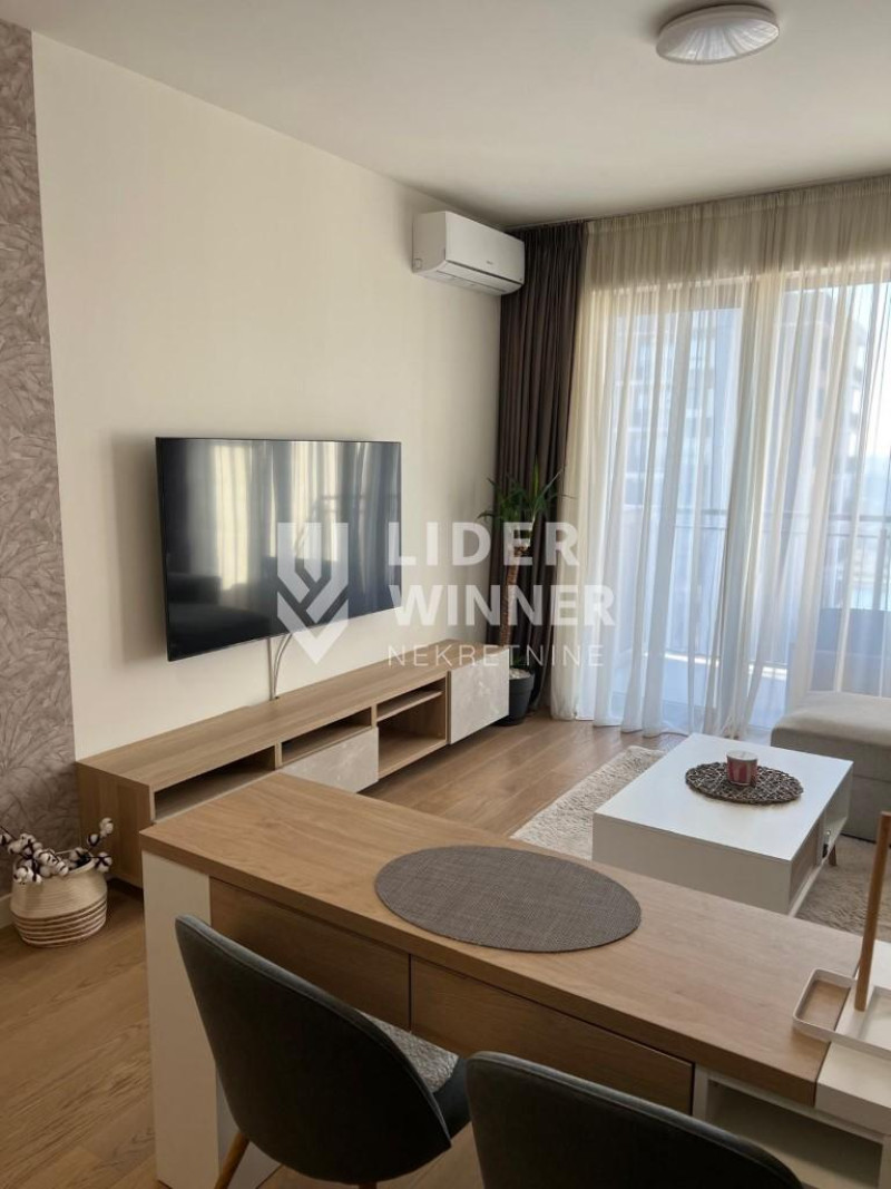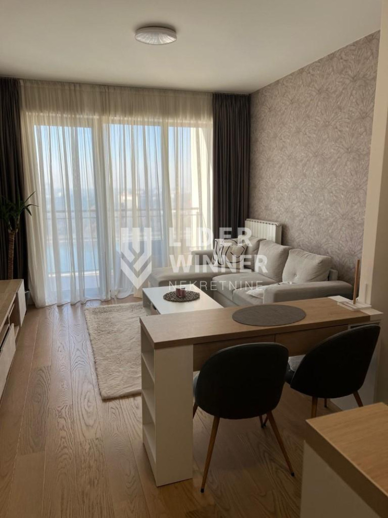 Moderno opremljen dvosoban stan. Strukturu stana open space dnevni boravak sa kuhinjom, odvojena spavaća soba, terasa sa pogledom na reku i kupatilo.