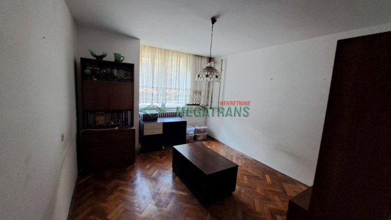 Trosoban, uknjižen na 66m2 + terasa 6m2 + ostava 20m2 + podrum + parking mesto u dvorištu.