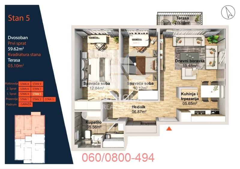Predstavljamo vam funkcionalan trosoban stan koji se sastoji od: dnevnog boravka sa otvorenom kuhinjom, dve spavace sobe, kupatila, terase i ulaznog hodnika.