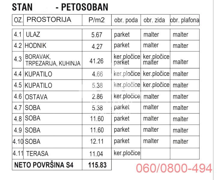 5.0, 115.53m2(terasa 11.04m2), lift, PS/2 , telefon, interfon. Građevinska dozvola.