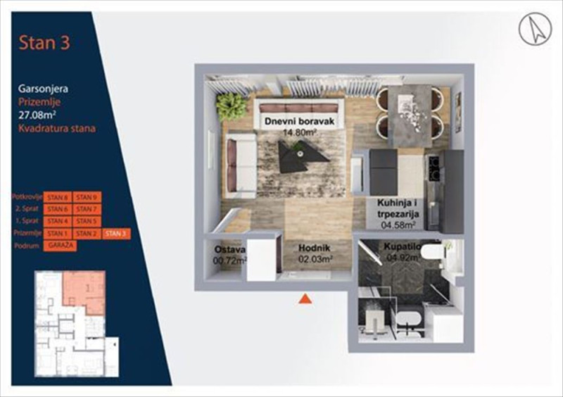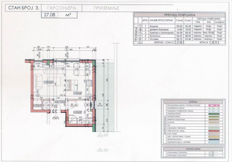 Prostorije: predsoblje, visenamenska soba sa kuhinjom, kupatilo, terasa.