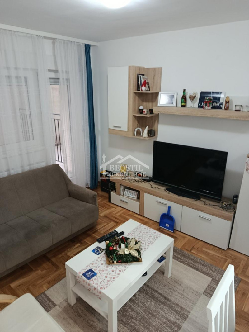 Odlično koncipiran jednoiposoban stan. Ulazni deo odvojen zidom od ostalog dela stana. Mala kuhinja i trpezarija, dnevni boravak, mali koridor do kupatila sa mestom za veš mašinu i dosta prostrane sobe sa pogledom n aterasu od 15m2. PVC stolarija sa roletnama, medijapan unutrašnja stolarija, hrastov parket.