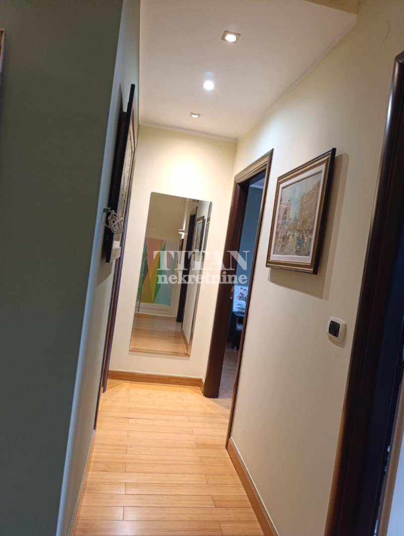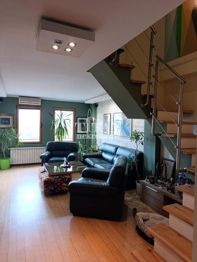 Dupleks, stan na dva nivoa u bloku 19a. Uknjizena povrsina stana je 96m2, stvarna, merena kvadratura stana je 120m2. Stan je u zgradi odlicne gradnje, garaza, dva lifta. Kompletno je renoviran, drvena/alu stolarija, bambusov parket, struja i vodovod instalacije, oba kupatila. Na prvom nivou stana povrsine 60 m2 je prostran dnevni boravak, kuhinja, trpezarija, kupatilo i ostava. Drugi nivo, dve spavace sobe, garderobna soba, soba za pranje odlaganje, peglanje vesa, kupatilo i hodnik