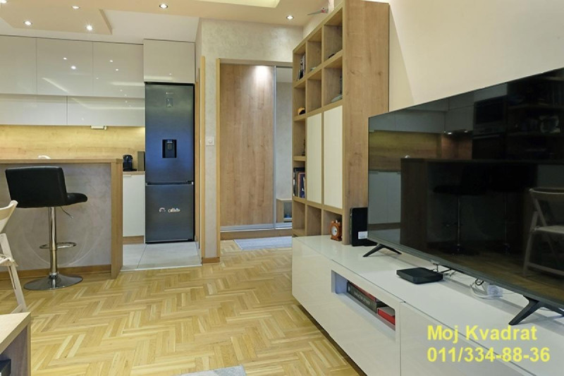 Svaki kvadrat u stanu je funkcionalan i iskorišćen. Hodnik ima veliki plakar (urađen po meri). Kuhinja je, takođe, rađena po meri i opremljena je svim potrebnim aparatima (ugradna rerna, indukciona ugradna ploča, ugradna mikrotalasna, frižider i mašina za sudove). Kupatilo je opremljeno tuš kabinom i mašinom za pranje i sušenje veša. Spavaća soba ima veliki bračni krevet i ugradni američki plakar. Rasveta u stanu je led (topla) sa potenciometrima. Parket je hrastov. Grejanje u stanu je na gas (leti se ne plaća, a zimi po potrošnji).