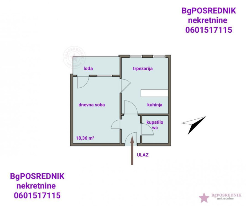 Prostorije: hodnik, dnevna soba, kuhinja sa trpezarijom, kupatilo/wc, lođa.
