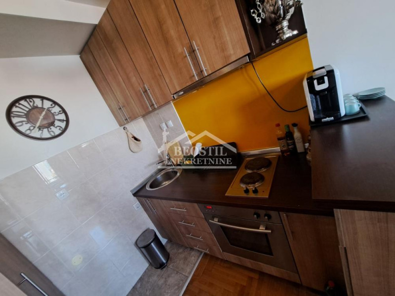 Stan orijentisan suprotno od ulice. Kombinovana soba sa kuhinjom i ležajem, kupatilo i hodnik, kompletnono opremljen u službi izdavanja stan na dan pa se takav prodaje.