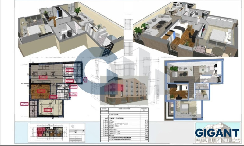 Prostorije: ulaz, toalet, kuhinja sa trpezarijom, dnevna soba, hodnik, kupatilo, dve spavaće sobe, terasa